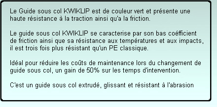Le guide sous col KWIKLIP se caracterise par son bas coéfficient de friction ainsi que sa résistance aux températures et aux impacts, il est trois fois plus résistant qu'un PE classique.