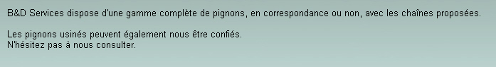 B&D Services dispose d'une gamme complète de pignons, en correspondance ou non, avec les chaînes proposées.